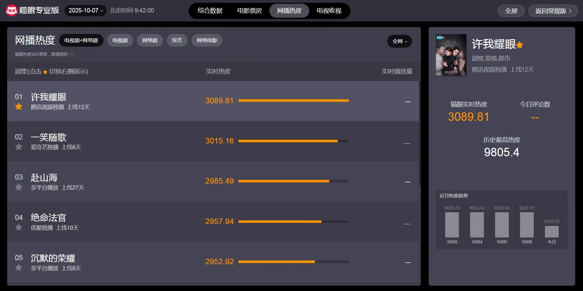 截止10月7日上午9时42分,从“猫眼专业版”实时数据显示可知,当前热播电视剧中,网播热度最高的五部剧分别如下: