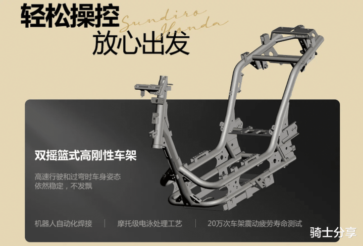 该车的动力源为60V23Ah铅酸电池组加1200W后轮直驱电机。其所采用的是双摇篮式高刚性车架,在保持韧性的同时整车重量的分布会比较均衡。